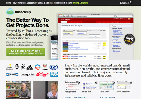 Basecamp很好的利用了空間。折疊線以上(768 像素高),它顯示一個巨大的截圖、標(biāo)語、有價值的主張、行為召喚、客戶列表、視頻和使用圖片展示的簡短特性列表。