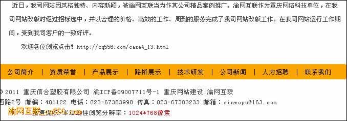近日,我司網(wǎng)站因風(fēng)格獨(dú)特、內(nèi)容新穎,被渝網(wǎng)互聯(lián)當(dāng)為作其公司精品案例推廣。渝網(wǎng)互聯(lián)作為網(wǎng)絡(luò)科技單位,在我司網(wǎng)站改版時(shí)經(jīng)過招標(biāo)選中,并以合理的價(jià)格、高效的工作、周到的服務(wù)完成了我司網(wǎng)站改版工作。在我司網(wǎng)站運(yùn)行工作期間,受到我司客戶的一致好評。