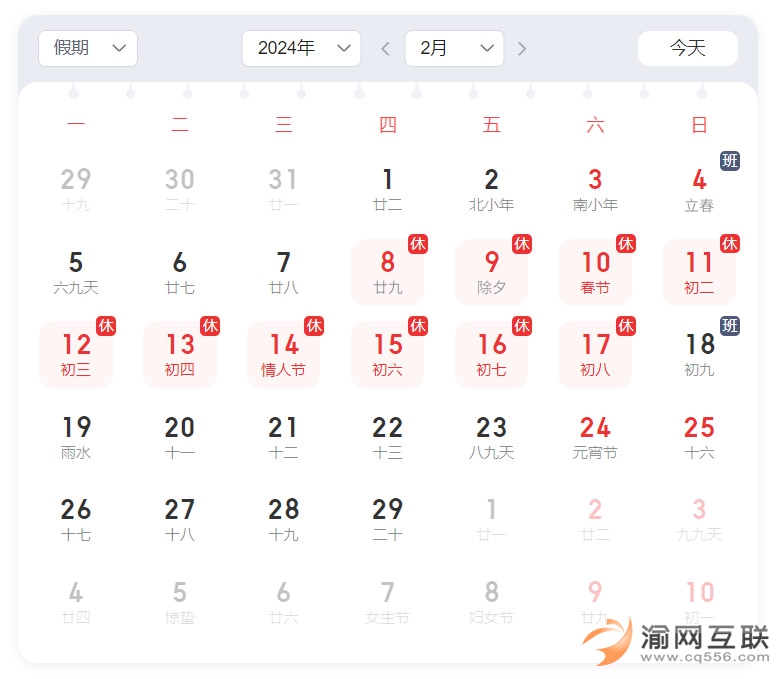 2024年2月8日 (星期四)中午至2月17日(星期六)),放假時(shí)間為10天。2月4日(星期天)、2月18日星期天為調(diào)休時(shí)間重慶公司正常上班。